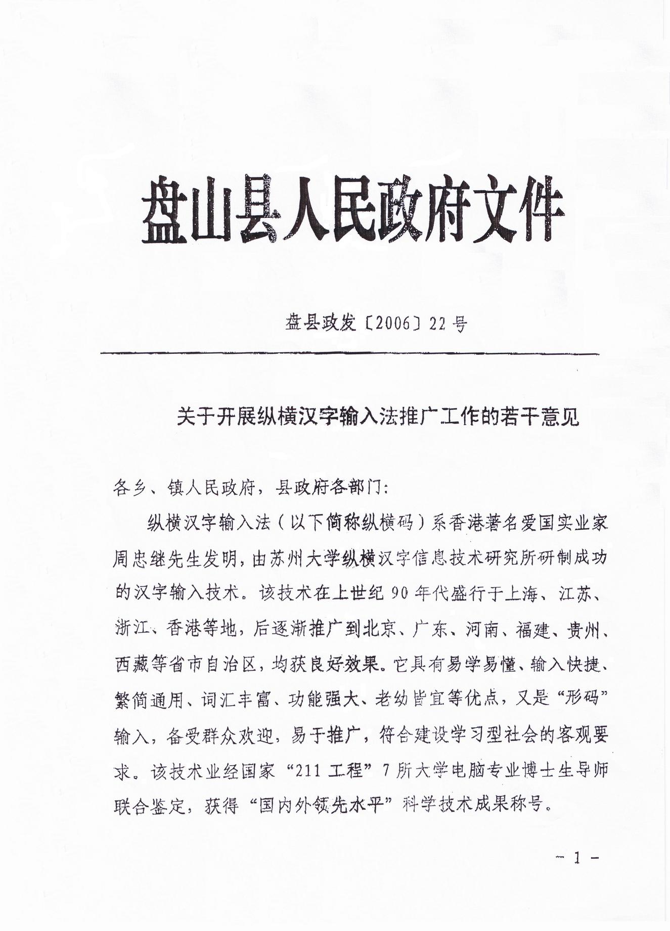 当前位置:纵横输入法首页>>前期新闻(2006年) 盘山县人民政府文件 关于开展纵横汉字输入法推广工作的若干意见 各乡、镇人民政府,县政府各部门: 纵横汉字输入法(以下简称纵横码)是香港著名爱国实业家周忠继先生发明,由苏州大学纵横汉字信息技术研究所研制成功的汉字输入技术。该技术在上世纪90年代盛行于上海、江苏、浙江、香港等地,后逐渐推广到北京、广东、河南、福建、贵州、西藏等省市自治区,均获良好效果。它具有易学易懂、输入快捷、繁简通用、词汇丰富、功能强大、老幼皆宜等优点,又是“形码”输入,备受群众欢迎,易于推广,符合建设学习型社会的客观要求。该技术业经国家“211工程”7所大学电脑专业博士生导师联合鉴定,获得“国内外领先水平”科学技术成果称号。 2006年8月,经过广泛深入的接触洽谈,周先生特许同意将盘山县作为东北三省第一个纵横码推广培训基地,并将在软件、教材、师资方面为我县提供无偿援助。为推广纵横码,进一步落实党的十六大报告提出“形成全民学习、终身学习的学习型社会,促进人的全面发展”的要求,加速中文电脑化、电脑化中文化的进程,结合我县实际,特提出如下意见: 一、提高认识,加强领导 纵横码作为一种先进的汉字输入技术,在全国广大地区已得到了广泛的应用。实践证明,该技术的推广和普及,对提高办公自动化程度、打造效能型政府具有十分重要的作用。因此,全县上下要切实提高对推广纵横码重要性的认识,把普及纵横码知识、应用纵横码技术作为提高工作效率、建设“学习型机关”的一项重要任务来抓。为保障此项工作的顺利开展,县政府成立盘山县推广纵横汉字输入法工作领导小组(名单随后),负责对纵横码推广工作的统筹、协调、指导及培训等工作。各乡镇、各部门要在县推广纵横汉字输入法工作领导小组的统一领导下,深入开展推广纵横码的各项工作,要结合实际,成立相应的组织机构,加强领导,为该技术的推广应用提供有力的组织保障。 二、加大宣传,扩大影响 要充分发挥新闻媒体的宣传、导向作用。县电台、电视台、新闻宣传中心要有计划地在全县范围内宣传纵横码的优势、特点,通过开设专栏、举办讲座,深入讲解纵横码的相关知识,系统报道推广纵横码先进经验和事迹,各乡镇也要采取有效措施,采用多种宣传形式,将纵横码带到基层、带到广大人民群众当中,扩大推广纵横码的社会影响。 三、积极推广,分类普及 推广纵横码,其根本目的在于普及纵横码,应用纵横码。普及纵横码指的是能应用“纵横输入法2002简易版”软件在电脑上输入汉字;学会电脑开机与关机程序;熟练掌握笔形代码、口诀以及单字、词组取码规则;熟练应用简码、小键盘上网冲浪、收发邮件、查资料、写文章等。学习纵横码是使用电脑的入门,应用纵横码则是提高运用信息技术的水平。所以,要把推广纵横码的过程作为普及计算机知识,提高全民科学文化素质的重要手段来抓。机关、学校、企事业单位是纵横码推广的重点,在今后的推广普及过程中,要结合不同单位、不同行业的实际和特点分类实施;要根据推广对象的年龄、职位性质、知识面,有针对性地采取相应措施,分阶段组织推广普及工作。 四、强化培训,深入研讨 推广纵横码,要在全县范围开展广泛的相关知识培训。要分部门、分行业地举办培训班,尤其要在广大中小学校、职业技术学校开展推广纵横码的教学活动,并逐步纳入到学习课程予以长期设置。培训工作要把握两个要点:一是要发挥纵横码特有的功能与优势,努力提高汉字输入速度;二是要扩大纵横码的应用,做到学纵横码与推进中小学生的素质教育相结合,与提高各行业的办事效率相结合。在强化培训的同时,还要走经常性的预计与交流之路,要通过深入研讨与交流,查找差距,交流经验,巩固成果,提高效率。 五、培养骨干,分步实施 推广纵横码,要坚持分步实施的原则。首先要培养一支热爱纵横码事业的管理人员和教学人员队伍,使之成为推广纵横码的骨干力量。为此,县政府拟于10月16日开始在县职教中心举办首批纵横码培训班,教育系统要选派30名骨干教师,县直机关要选派10名业务骨干参加(具体培训情况另行通知)。这些业务骨干要认真学习,逐步熟悉掌握纵横码,成为推广纵横码的骨干力量,成为所在行业和部门纵横码知识的传授者。首批培训班结业后,由这批业务骨干负责按照行业和部门搞好各乡镇和县政府各部门的纵横码培训工作,要求在年末前完成总体轮训工作,明年3月末由县教育局负责对普及推广情况进行考核验收,以确保做到全面掌握、全部普及。 附件:盘山县推广纵横汉字输入法工作领导小组人员名单 二○○六年八月二十八日 附件: 盘山县推广纵横汉字输入法工作领导小组人员名单