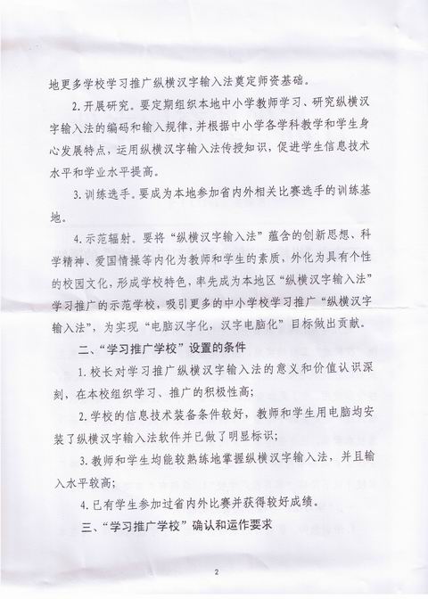 當前位置:縱橫輸入法首頁>>前期新聞(2007年) 江蘇省教育廳文件 蘇教備〔2007〕1號 關於建立「縱橫漢字輸入法學習推廣學校」的通知 各市教育局: 近几年來,隨著我省中小學信息技術教育的發展,特別是伴隨「校校通」工程的實施,由香港蘇浙滬同鄉會主席周忠繼先生發明的縱橫漢字輸入法,已為愈來愈多的江蘇中小學 校所認識、接受和使用。為了更加有效地在全省中小學校推廣學習縱橫漢字輸入法,讓更多的中小學生掌握和運用縱橫漢字輸入法,提高信息技術素養,經與香港蘇浙滬同鄉會協商,決定由該會與我廳聯合在全省具備條件的中小學建立一批縱橫漢字輸入法學習推廣學校(以下簡稱「學習推廣學校」)。現將有關事項通知如下: 一、「學習推廣學校」應有的功能作用 1. 培訓教師。要有計劃地培訓本地中小學校的教師,為在本地更多學校學習推廣縱橫漢字輸入法奠定師資基礎。 2. 開展研究。要定期組織本地中小學教師學習、研究縱橫漢字輸入法的編碼和輸入規律,並根據中小學各學科教學和學生身心發展特點,應用縱橫漢字輸入法傳授知識,促進學生信息技術水平和學業水平提高。 3. 訓練選手。要成為本地參加省內外相關比賽選手的訓練基地。 4. 示範輻射。要將「縱橫漢字輸入法」蘊含的創新思想、科學精神、愛國情操等內化為教師和學生的素質,外化為具有個性的校園文化,形成學校特色,率先成為本地區「縱橫漢字輸入法」學習推廣的示範學校,吸引更多的中小學校學習推廣「縱橫漢字輸入法」,為實現「電腦漢字化,漢字電腦化」目標作出貢獻。 二、「學習推廣學校」設置的條件 1. 校長對學習推廣縱橫漢字輸入法的意義和價值認識深刻,在本校組織學習、推廣的積極性高; 2. 學校的信息技術裝備條件較好,教師和學生用電腦均安裝了縱橫漢字輸入法軟件並已做了明顯標識; 3. 教師和學生均能較熟練地掌握縱橫漢字輸入法,並且輸入水平較高; 4. 已有學生參加過省內外比賽並獲得較好成績。 三、「學習推廣學校」確認和運作要求 1. 關於申報工作。各市要根據設置條件,在調查研究基礎上,遴選具備條件的「學習推廣學校」。推荐名單和材料於5月1日前寄送江蘇省教育裝備與勤工儉學管理中心。 2. 關於授牌。省教育廳將會同香港蘇浙滬同鄉會對各市推荐申報的「學習推廣學校」進行評審,凡合格的學校由省教育廳和香港蘇浙滬同鄉會授予「學習推廣學校」校牌。 3. 提供組織保證。各市教育局要明確責任部門和責任人具體負責組織和指導「學習推廣學校」的相關工作。 「學習推廣學校」的建立是我省中小學素質教育一個重要有機組成部分,各地、各校要加強組織領導,把工作落實到實處。每年要制定學習培訓計劃,並根據學校工作的特點,有計劃、分步驟地開展培訓、訓練、研究等工作,以紮實、細緻、有效的學習、推廣工作促進我省中小學信息技術現代化的建設水平。 二○○七年二月十四日 主題詞:縱橫碼漢字輸入法△ 學校 通知 江蘇省教育廳辦公室 2007年2月15日印發