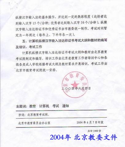 北京市教育委员会关于举办「北京市计算器纵横汉字输入法达标证书培训及考试通知」